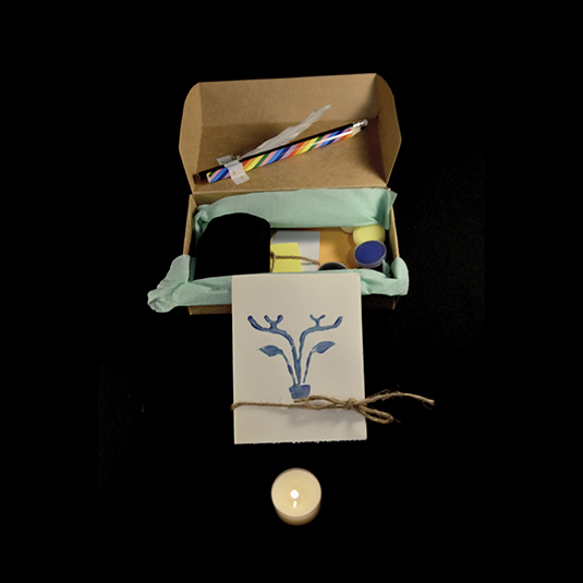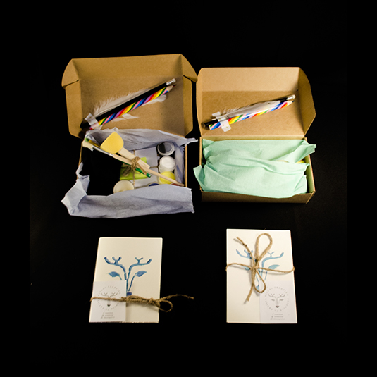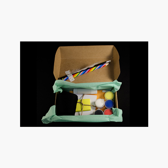 En el interior de la caja encontrarás: - Vela - Lápices - Pinceles - Acrílicos de 5 colores - Pegamento - Esponja - Hojas - 8 Papeles con diseño y colores - Cartón con forma de marco de fotografía - Post-it - Pluma - Sobre sorpresa con elementos en su interior *Los primeros 10 kit obtendrán un antifaz hecho a mano de regalo* Cada kit tiene un elemento sorpresa e incluye una sesión ritual creativa colectiva online.