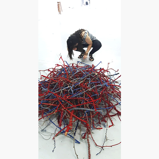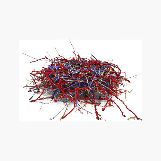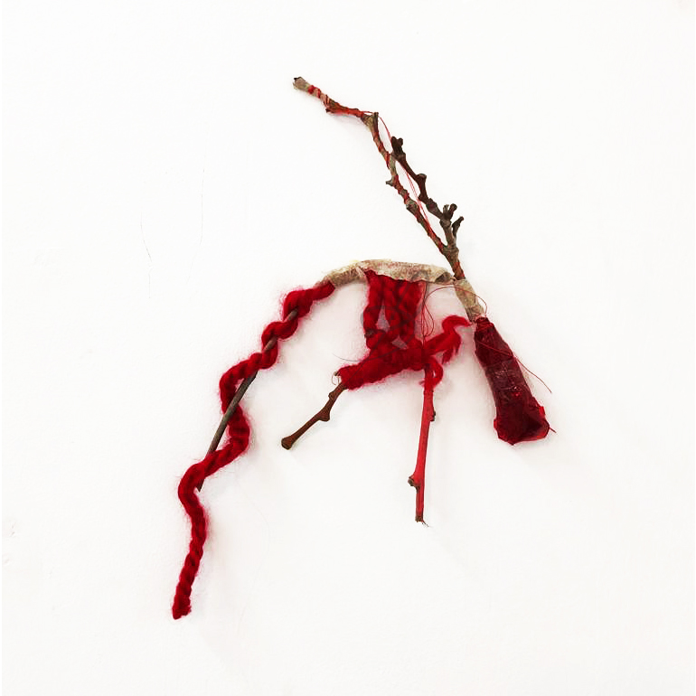 Hilo rojo sobre papeles, lanas rojas y azul, celo, ramas de árboles. Escultura ramas de árboles intervenidas con lanas azul y rojo.