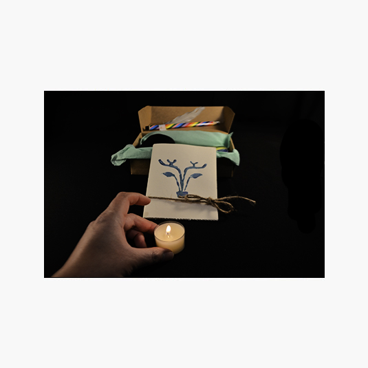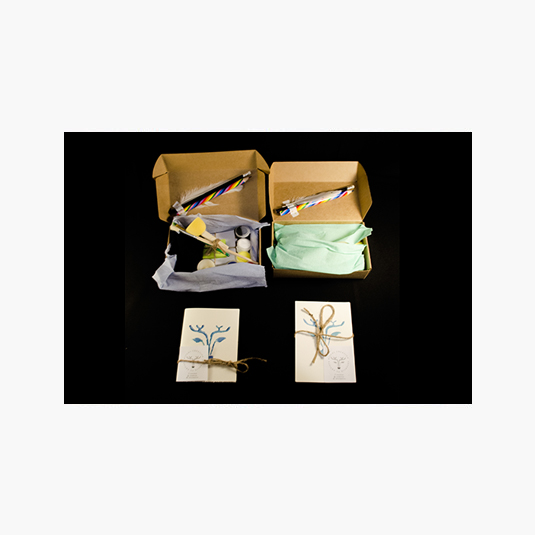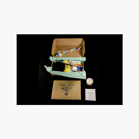 En el interior de la caja encontrarás: - Vela - Lápices - Pinceles - Acrílicos de 5 colores - Pegamento - Esponja - Hojas - 8 Papeles con diseño y colores - Cartón con forma de marco de fotografía - Post-it - Pluma - Sobre sorpresa con elementos en su interior *Los primeros 10 kit obtendrán un antifaz hecho a mano de regalo* Cada kit tiene un elemento sorpresa e incluye una sesión ritual creativa colectiva online.