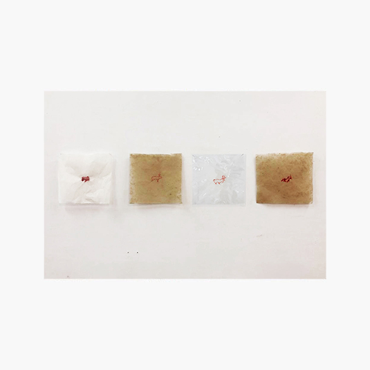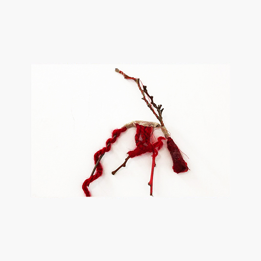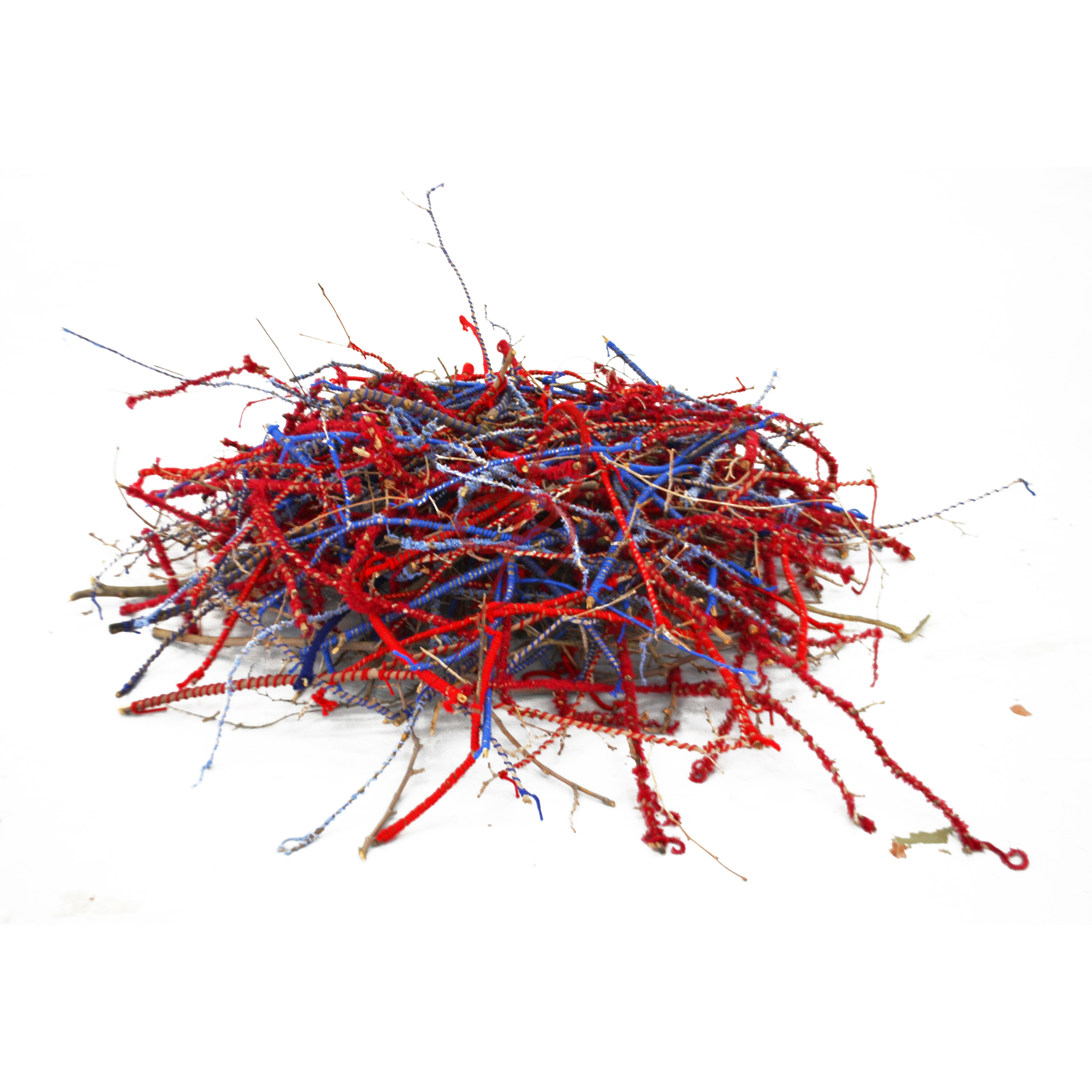Hilo rojo sobre papeles, lanas rojas y azul, celo, ramas de árboles. Escultura ramas de árboles intervenidas con lanas azul y rojo.