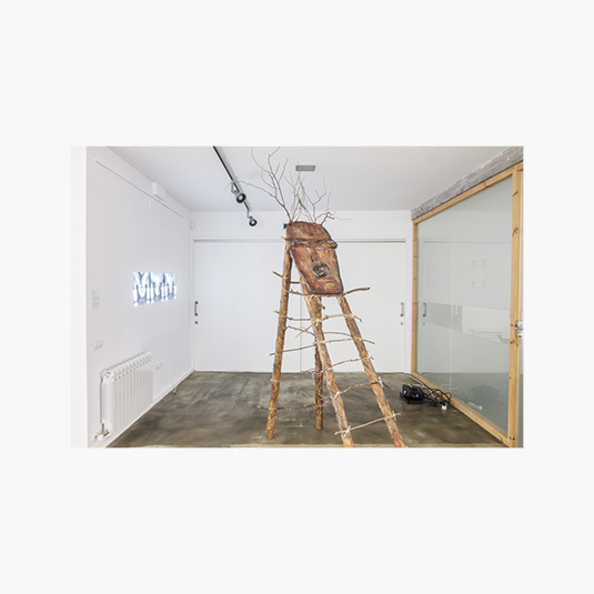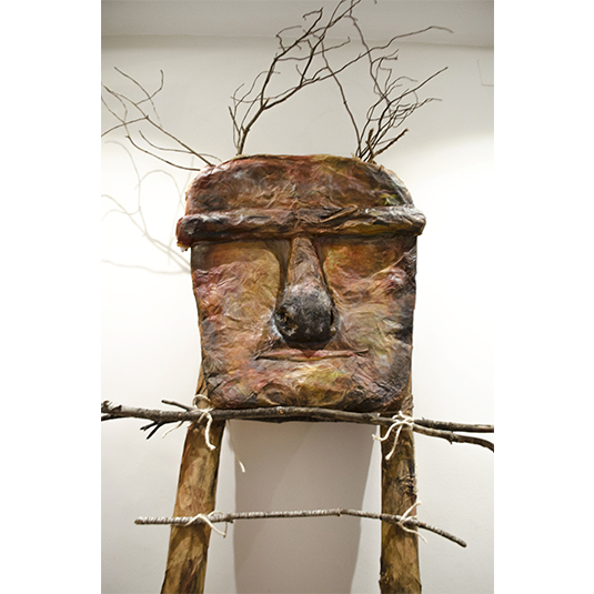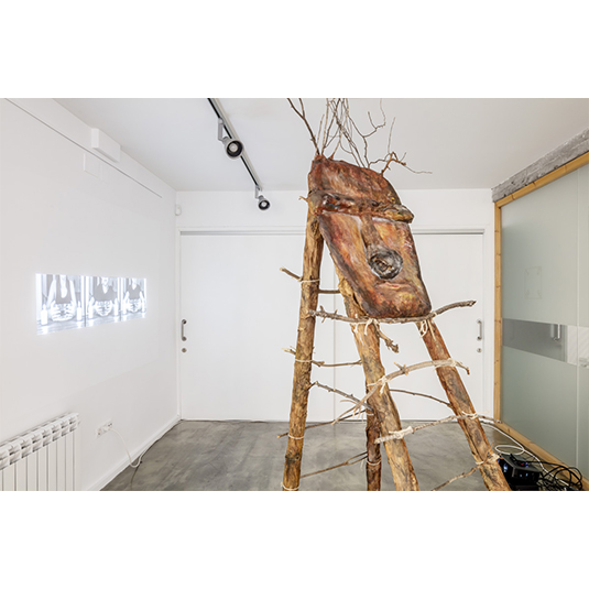 Instalación escultura, papel kraft, cartón, ramas de árboles, lanas y pintura acrílica. Vídeo duración 8:18 min, diseño sonoro interpretado especialmente para la obra